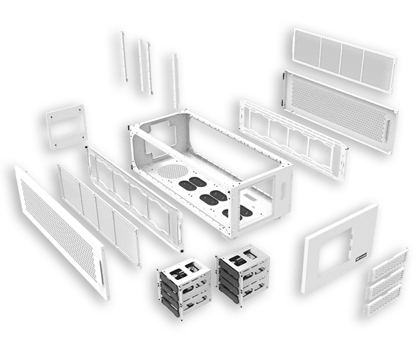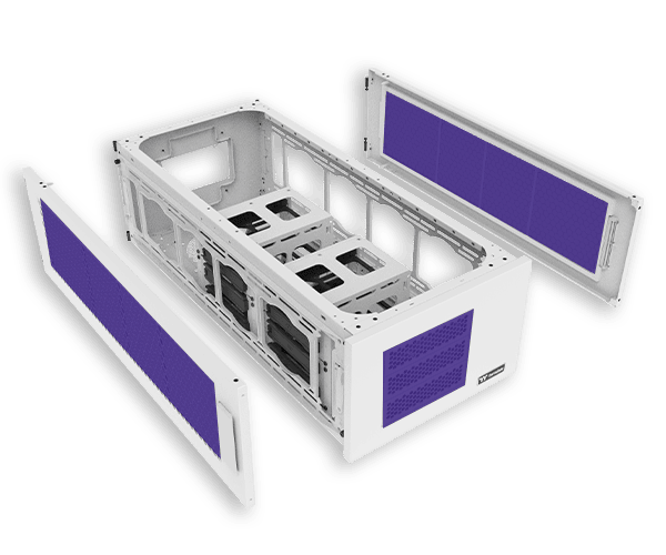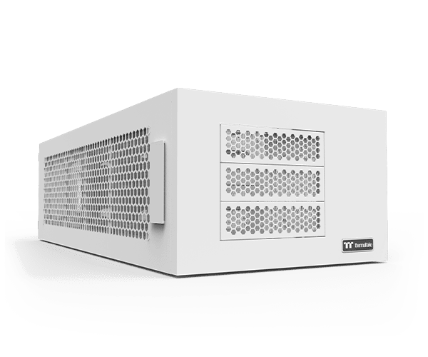 The AX100 Snow is an add-on chamber that enhances the AX700 chassis by adding extra power, storage, and cooling options. It supports a standard PS2 PSU for additional power management and offers space for up to eight HDDs or SSDs. Additionally, the AX100 Snow accommodates up to eight 120mm or 140mm fans and dual 560mm radiators on both sides for optimal thermal performance.