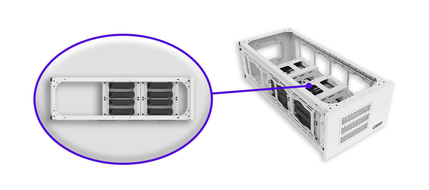 For storage compatibility, The AX100 Snow supports up to eight 2.5‘’ SSDs or 3.5‘’ HDDs in total.